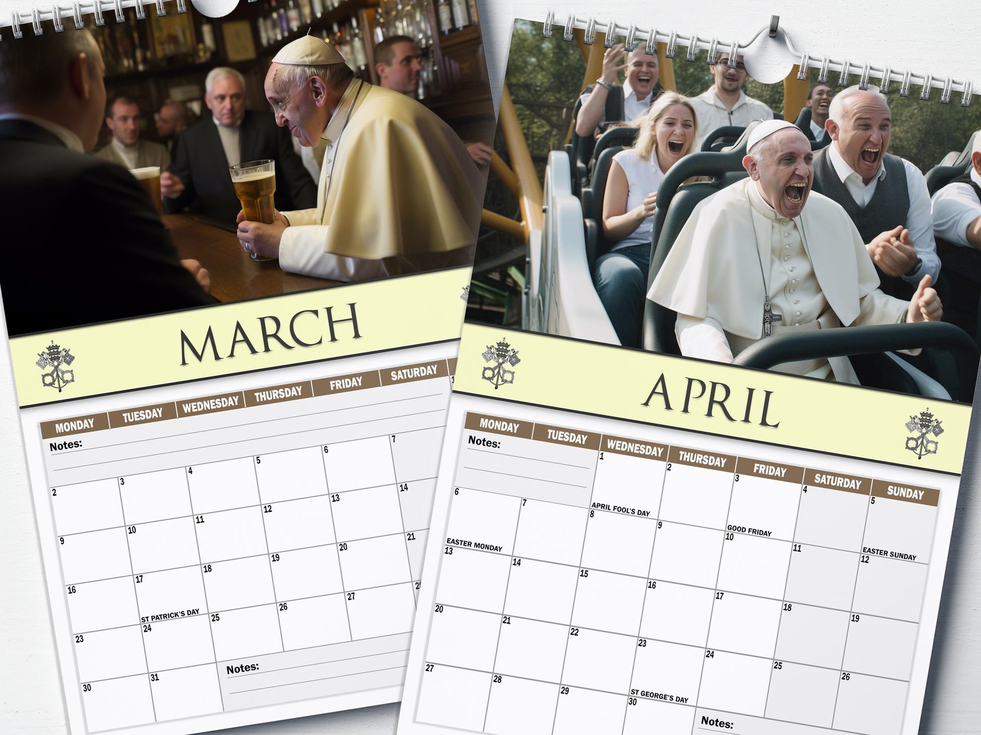 Perfect for fans of satirical art, those with a sense of humour, or anyone who enjoys a good laugh, the 'Pope Francis' calendar also makes for an excellent gift. Whether it's for a birthday, holiday, or just because, this calendar is sure to delight and amuse.
